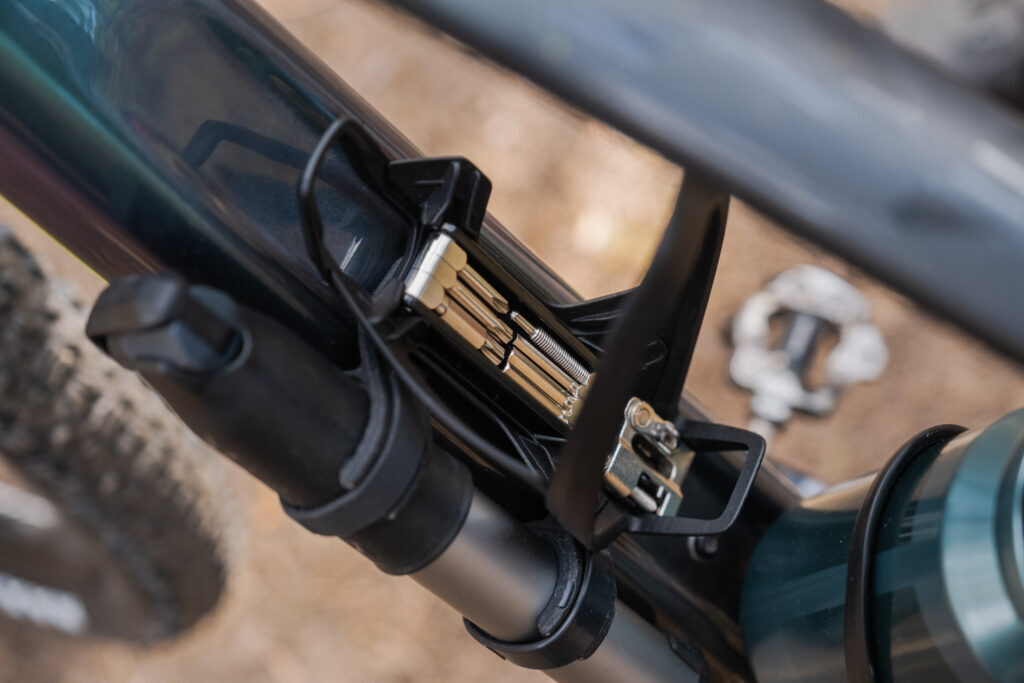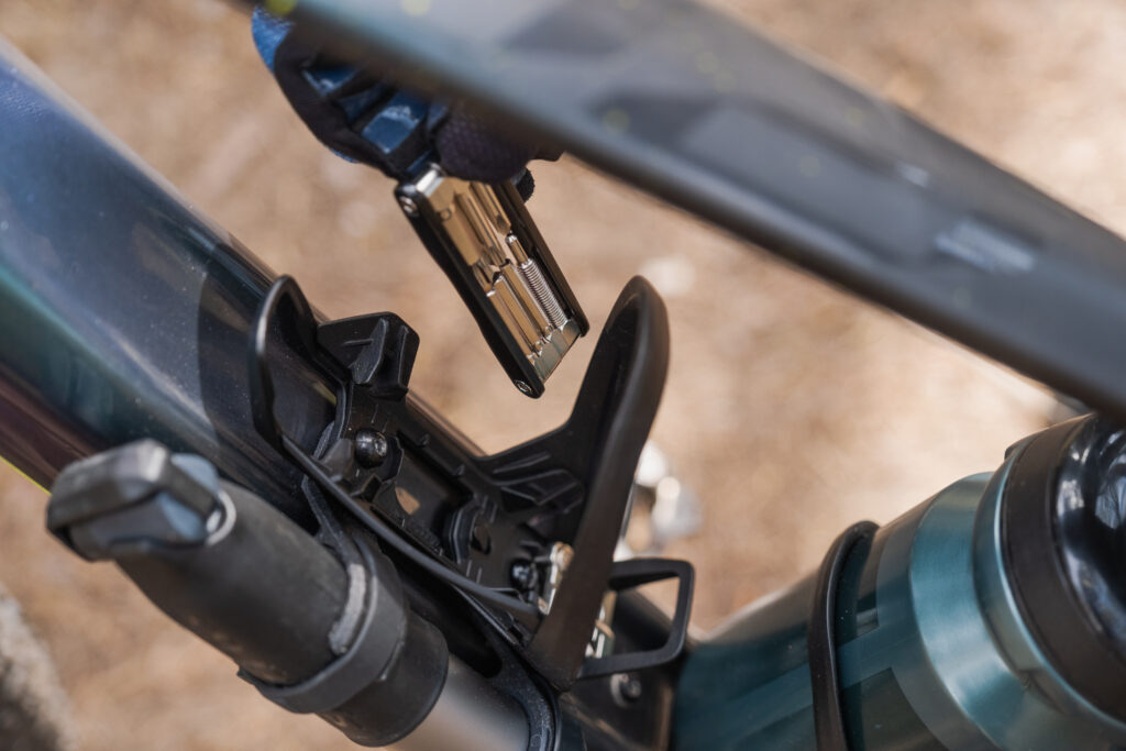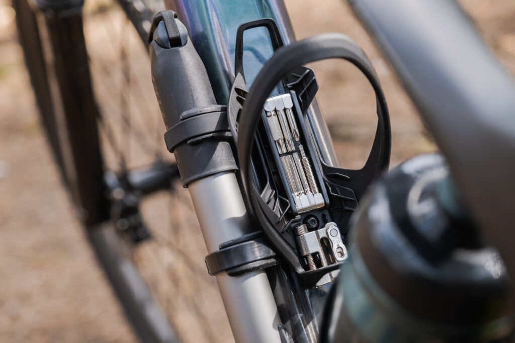 iS står for Integrated Storage, og giver plads til Syncros multitool, og enten en lille håndpumpe eller Co2 inflator, hvis du er mere til det. En af de nye smarte features, hvor Tailor Cage skiller sig ud, er at flaskeholderen kan drejes 45 grader til begge sider, hvilket giver bedre plads til tilbehøret, og gør det nemmere at hive flasken ud.